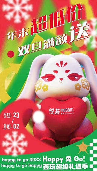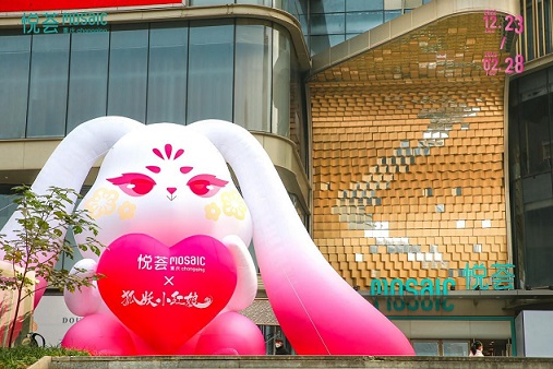 重慶悅薈1/3號門廣場外5米高的聯名IP定制兔,既是IP形象的抓取,又是新年兔年形象的昭示;