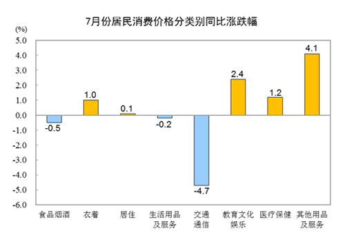7月份,食品煙酒類價(jià)格同比下降0.5%,影響CPI(居民消費(fèi)價(jià)格指數(shù))下降約0.14個(gè)百分點(diǎn)。食品中,畜肉類價(jià)格下降14.0%,影響CPI下降約0.48個(gè)百分點(diǎn),其中豬肉價(jià)格下降26.0%,影響CPI下降約0.41個(gè)百分點(diǎn);鮮菜價(jià)格下降1.5%,影響CPI下降約0.03個(gè)百分點(diǎn);鮮果價(jià)格上漲5.0%,影響CPI上漲約0.10個(gè)百分點(diǎn);水產(chǎn)品價(jià)格上漲0.4%,影響CPI上漲約0.01個(gè)百分點(diǎn);糧食價(jià)格上漲0.3%,影響CPI上漲約0.01個(gè)百分點(diǎn)。