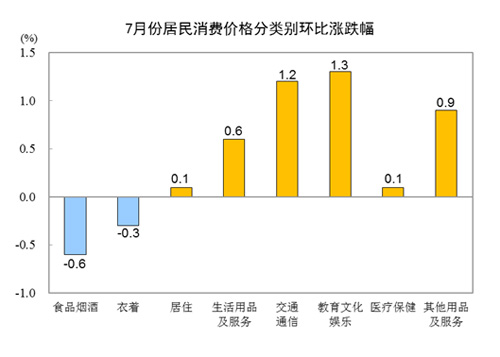 7月份,全國(guó)居民消費(fèi)價(jià)格環(huán)比上漲0.2%。其中,城市上漲0.3%,農(nóng)村持平;食品價(jià)格下降1.0%,非食品價(jià)格上漲0.5%;消費(fèi)品價(jià)格下降0.1%,服務(wù)價(jià)格上漲0.8%。