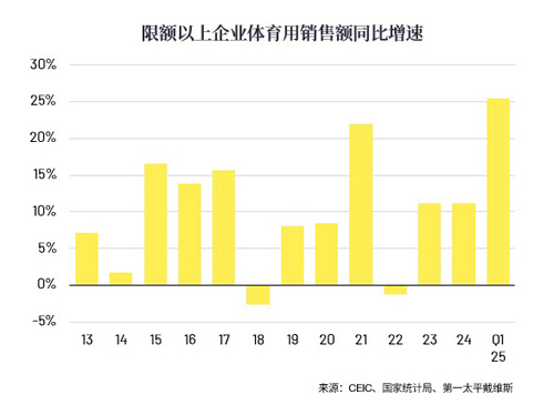 體育運(yùn)動(dòng)消費(fèi)規(guī)模不斷擴(kuò)大,已成為消費(fèi)市場(chǎng)的重要增長(zhǎng)點(diǎn)。國(guó)家統(tǒng)計(jì)局?jǐn)?shù)據(jù)顯示,體育運(yùn)動(dòng)用品類2025年第一季度的限額以上企業(yè)銷售增幅高達(dá)25.4%,創(chuàng)下近三年來新高。