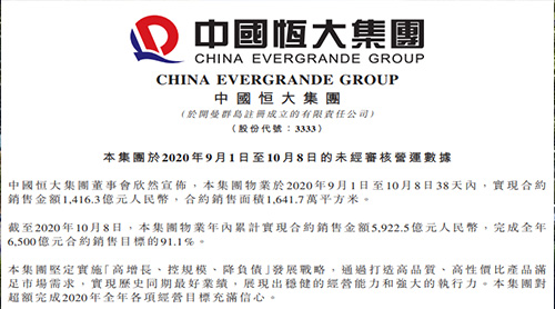 10月9日,中國恒大發(fā)布最新公告,9月1日-10月8日共計38天,公司累計實現(xiàn)銷售1416.3億,創(chuàng)同期歷史新高。截至目前,恒大年內(nèi)已實現(xiàn)銷售額5922.5億,完成全年6500億銷售目標的91%。