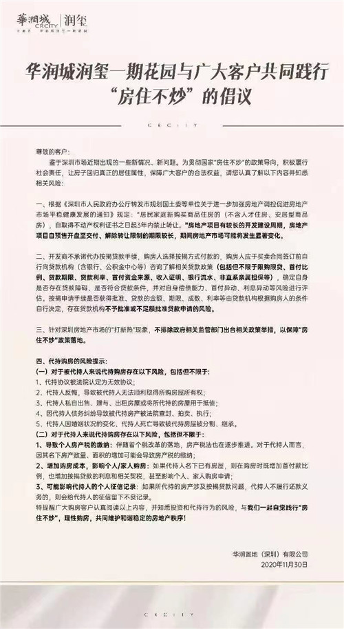 11月30日晚間,有著深圳“網(wǎng)紅盤”之稱,出現(xiàn)“萬人搖號”、“眾籌打新”等情況的華潤城潤璽發(fā)布了一封名為“房住不炒”的倡議。