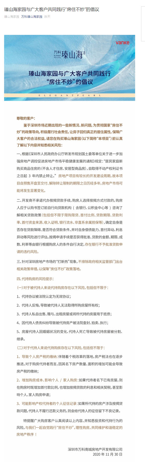 此外,深圳另一個(gè)“網(wǎng)紅盤”萬科瑧山海項(xiàng)目也發(fā)布了一封類似的“房住不炒”倡議。