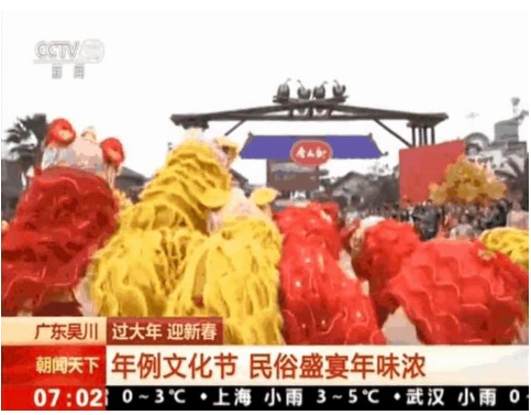 鼎龍灣年例文化節(jié)盛況空前,受到央視新聞?lì)l道《朝聞天下》、《新聞直播間》、央視中文國(guó)際頻道關(guān)注與報(bào)道,同時(shí)也受到廣東衛(wèi)視、湛江電視臺(tái)、吳川電視臺(tái)等本地媒體關(guān)注,為珠三角等全國(guó)人民所知曉。全國(guó)近30個(gè)城市500家,媒體聯(lián)合追蹤報(bào)道,其中主流媒體超150家。2次登陸時(shí)代廣場(chǎng),超400家外媒爭(zhēng)先報(bào)道粵西非遺暨年例文化節(jié),近200國(guó)家見(jiàn)證粵西非遺文化走向世界。