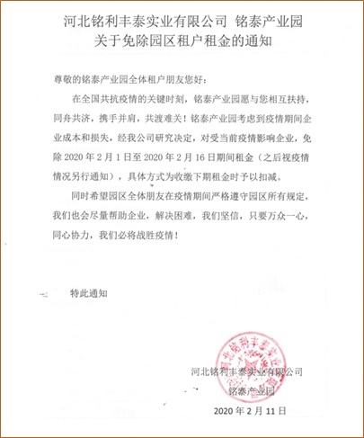 受新型冠狀病毒肺炎疫情影響,疫情仍在繼續(xù),依舊牽動著每一個人的心。園區(qū)企業(yè)經(jīng)營運(yùn)作承壓,河北銘利豐泰實(shí)業(yè)有限公司·銘泰產(chǎn)業(yè)園感同身受。為鼓勵園區(qū)企業(yè)響應(yīng)政府號召采取延遲開工的方式緩沖疫情影響,為減輕疫情對園區(qū)企業(yè)日常運(yùn)營造成的影響,體現(xiàn)園區(qū)的責(zé)任擔(dān)當(dāng)。銘泰產(chǎn)業(yè)園決定對園區(qū)入駐企業(yè)提供租金減免措施,疫情無情,園區(qū)有愛;以鼓勵和支持企業(yè)以延緩開工、網(wǎng)絡(luò)辦公、遠(yuǎn)程會議等方式開展工作,共克時艱。