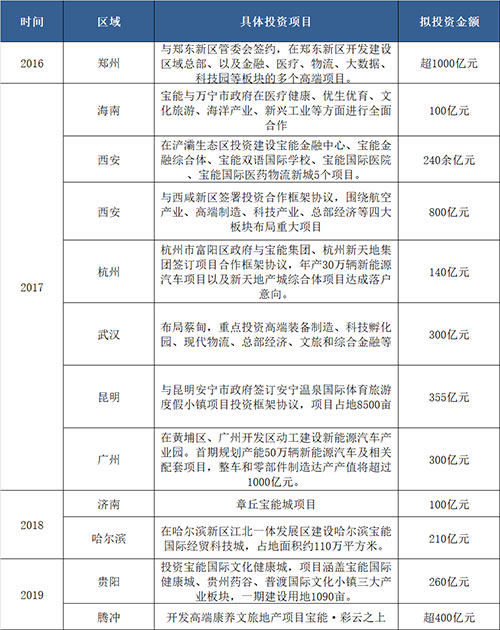 2017年以來,寶能先后簽下海南、西安、武漢、濟南、哈爾濱等多個百億級的投資大單,并憑借旗下新能源汽車業(yè)務相繼在杭州、昆明、廣州、西安西咸新區(qū)以及昆山與當?shù)卣炗喗⑿履茉雌嚠a(chǎn)業(yè)園的合作協(xié)議。據(jù)不完全統(tǒng)計,目前寶能在各地的投資計劃總金額已經(jīng)超過4000億元。