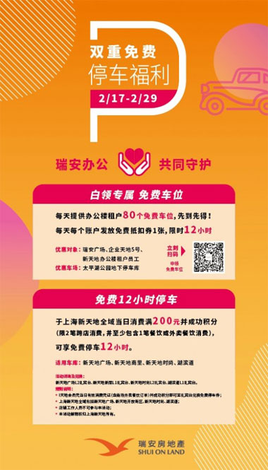 據(jù)悉,2月17日至29日期間,虹橋天地辦公樓白領(lǐng)每天可享受4小時免費(fèi)停車福利,并可與i天地積分兌換停車優(yōu)惠共享,最高每天免停8小時;瑞安廣場、企業(yè)天地5號、新天地辦公樓租戶則將享受“白領(lǐng)專屬免費(fèi)車位”+“免費(fèi)12小時停車”雙重福利:在活動期間每天向辦公樓租戶提供80個免費(fèi)車位并每天向每個賬戶發(fā)放1張限時免費(fèi)抵扣券;此外,于上海新天地全域當(dāng)日消費(fèi)滿200元并成功積分(限2筆跨店消費(fèi),并至少包含1筆餐飲或外賣餐飲消費(fèi)),還可享受免費(fèi)停車12小時。