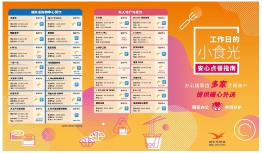 其中,瑞安房地產(chǎn)旗下新天地全域項(xiàng)目(湖濱道購物中心、新天地廣場、新天地南北里街區(qū)、新天地時尚)已推出“工作日安心點(diǎn)餐指南”,為白領(lǐng)提供辦公樓周邊多家優(yōu)質(zhì)商戶的外賣榜單,為無接觸外賣帶來更多營養(yǎng)美味的選擇,全面守護(hù)白領(lǐng)健康。