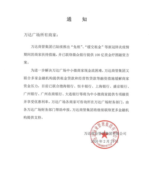 房訊網(wǎng)訊 2月24日,萬(wàn)達(dá)商業(yè)管理集團(tuán)發(fā)布通知,繼聯(lián)絡(luò)微眾銀行提供100億資金紓困融資方案后,萬(wàn)達(dá)商管集團(tuán)又聯(lián)合多家金融機(jī)構(gòu)提供租金貸款和經(jīng)營(yíng)性貸款等融資措施緩解商家資金壓力,進(jìn)一步解決萬(wàn)達(dá)廣場(chǎng)中小微商家現(xiàn)金流困難。