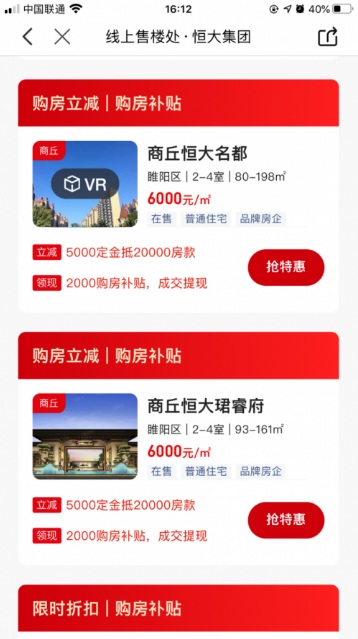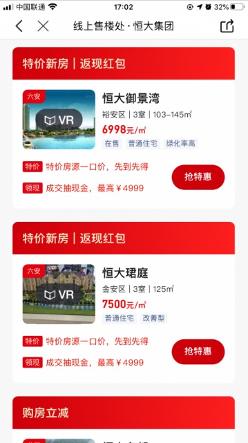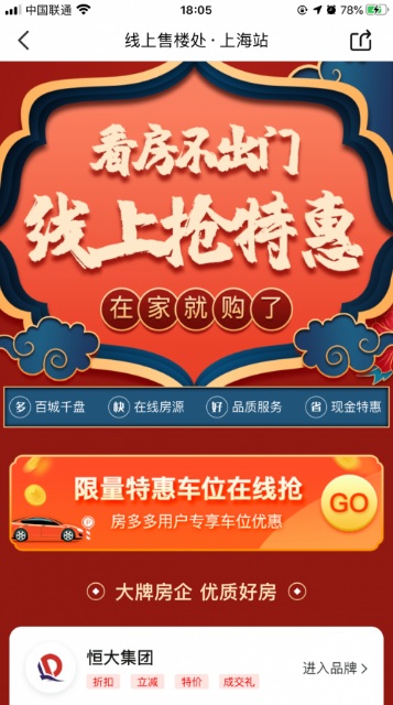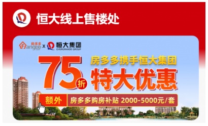 2月中旬,針對恒大推出的75折購房優(yōu)惠,房多多APP上線恒大品牌專區(qū),消費者可以實現(xiàn)一站式看盡恒大全國項目,并可通過在線支付小額定金來鎖定房源,還可疊加“購房立減”、“限時折扣”、“返現(xiàn)紅包”等多重購房特權(quán)。