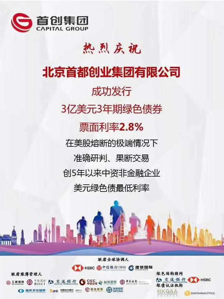 3月11日,首創(chuàng)集團在美股熔斷,境外債券市場巨幅波動的極端情況下,準確研判形勢、夯實基石訂單、果斷宣布交易,成功完成3年期3億美元綠色債券發(fā)行,票面利率2.8%/年,創(chuàng)下集團歷史上最低境外債券市場融資成本,創(chuàng)5年以來中資非金融企業(yè)綠色美元債最低利率,本次債券也是首支在香港、澳門兩地同時上市,獲得綠色雙認證的創(chuàng)新債券。