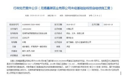嘉御置業(yè)違反了《無(wú)錫市城鄉(xiāng)規(guī)劃條例》第三十八條第二款規(guī)定,屬于未經(jīng)基礎(chǔ)驗(yàn)線擅自繼續(xù)施工的行為。無(wú)錫市城市管理綜合行政執(zhí)法局依據(jù)《無(wú)錫市城鄉(xiāng)規(guī)劃條例》第四十九條第(二)項(xiàng)的規(guī)定,于2019年8月27日作出罰款人民幣5000元的行政處罰。處罰公開日期為2020年3月19日。