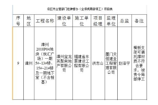 2019年11月21日,福建省住房和城鄉(xiāng)建設(shè)廳網(wǎng)站發(fā)布《關(guān)于2019年8-10月份房建市政工程安全質(zhì)量監(jiān)督檢查情況的處理意見》顯示,漳州2018P04地塊(悅匯廣場(chǎng))一期5#-13#樓、15#-21#樓及一期地下室(不含樁基)被責(zé)令局部停工,因其模板支架可調(diào)托撐材質(zhì)不符合要求。該工程建設(shè)單位為漳州寶龍英聚房地產(chǎn)有限公司;施工單位為福建省東霖建設(shè)工程有限公司;監(jiān)理單位為廈門天恒建業(yè)工程管理有限公司。