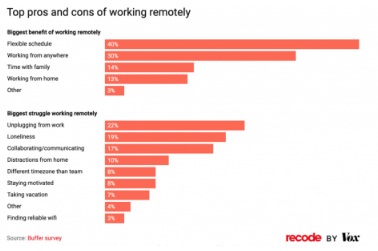 對(duì)于企業(yè)主們來(lái)說(shuō),遠(yuǎn)程辦公讓他們對(duì)員工的監(jiān)督力下降。此外,遠(yuǎn)程辦公讓建立和維持公司文化變得艱難。美國(guó)社交媒體管理公司Buffer的一項(xiàng)調(diào)查指出,遠(yuǎn)程工作最常見(jiàn)的弊端是無(wú)法離線(unplug),孤獨(dú)和難以協(xié)作。