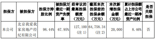 截至公告日,在2018年年度股東大會(huì)批準(zhǔn)的擔(dān)保額度14.36億元內(nèi),我愛我家對(duì)我愛我家房地產(chǎn)經(jīng)紀(jì)申請(qǐng)借款及授信提供的實(shí)際擔(dān)保金額為5.48億元,未超過該次股東大會(huì)批準(zhǔn)的擔(dān)保額度。