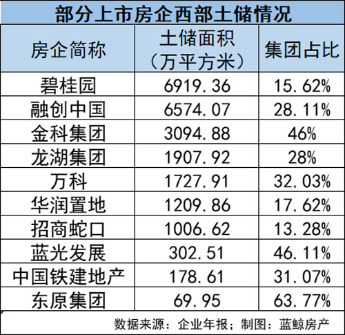 而從房企的土儲(chǔ)面積來看,碧桂園、融創(chuàng)中國、萬科等全國性房企均在西部地區(qū)擁有大量的土地儲(chǔ)備。截至2019年12月31日,碧桂園在西部地區(qū)擁有土儲(chǔ)面積6919.36萬平方米,高居榜首;融創(chuàng)以6574.07萬平方米的土地儲(chǔ)備位居第二。