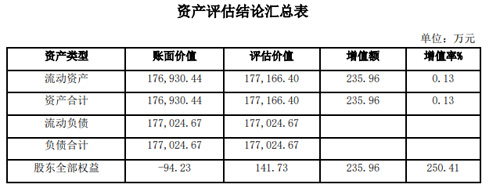 按照資產(chǎn)基礎(chǔ)法評(píng)估,武漢怡置明鴻在評(píng)估基準(zhǔn)日的資產(chǎn)總額賬面價(jià)值為17.69億元,評(píng)估價(jià)值為17.72億元,增值率為0.13%,負(fù)債總額賬面價(jià)值為17.70億元,評(píng)估價(jià)值為17.70億元,無(wú)增減值,股東全部權(quán)益賬面價(jià)值-94.23萬(wàn)元,評(píng)估價(jià)值為141.73萬(wàn)元,增值率為250.41%。