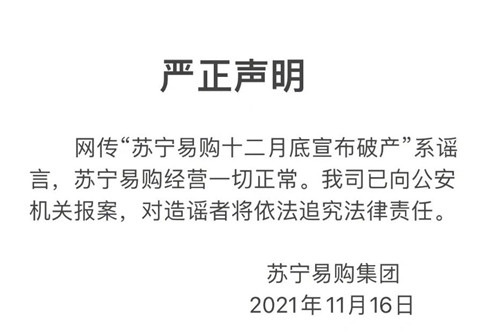 房訊網(wǎng)訊 11月16日,蘇寧易購官方微博發(fā)布嚴正聲明稱,“蘇寧易購十二月底宣布破產(chǎn)”為謠言,公司經(jīng)營一切正常。已向公安機關(guān)報案,對造謠者將依法追究法律責(zé)任。