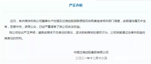 房訊網(wǎng)訊 12月18日,中國泛?毓杉瘓F有限公司官網(wǎng)發(fā)布聲明稱:近日,有關(guān)媒體稱公司董事長盧志強及泛海控股因聯(lián)想股權(quán)收購事宜被相關(guān)部門調(diào)查,該報道純屬無中生有,惡意中傷,誤導公眾,已經(jīng)嚴重侵害了公司合法權(quán)益。