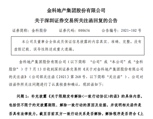 在回復(fù)函中,金科股份表示,為進(jìn)一步明確各股東方意見(jiàn),公司在收到關(guān)注函后,于2021年7月13日再次就是否解除一致行動(dòng)關(guān)系向黃紅云先生、重慶市金科投資控股(集團(tuán))有限責(zé)任公司、陶虹遐女士及重慶虹淘文化傳媒有限公司發(fā)函問(wèn)詢(xún),“雙方均未就解除《一致行動(dòng)協(xié)議》做出明確意思表示,故未產(chǎn)生解除《一致行動(dòng)協(xié)議》的法律后果”。