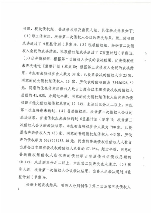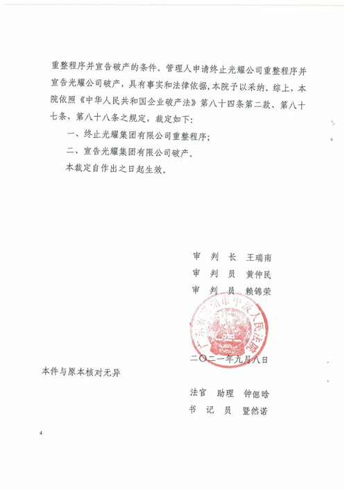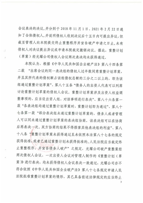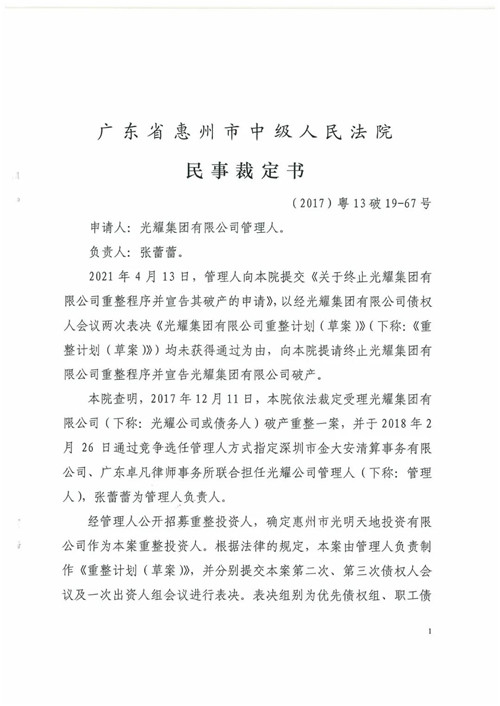 經(jīng)本案債權(quán)人會議兩次表決,《光耀集團有限公司重整計劃(草案)》均未獲得通過,光耀集團符合《中華人民共和國企業(yè)破產(chǎn)法》第二條、第八十八條規(guī)定的應(yīng)終止重整程序并宣告破產(chǎn)的情形,管理人已于2021年3月15日依法向惠州中院提請裁定終止光耀集團重整程序,并宣告光耀集團破產(chǎn)。