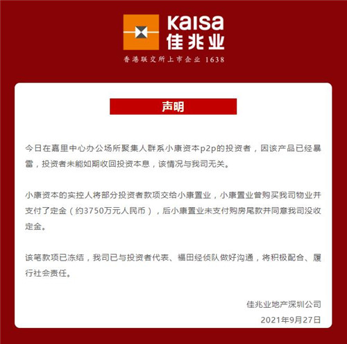 房訊網(wǎng)訊 9月27日,深圳佳兆業(yè)微信公眾號(hào)發(fā)布聲明稱(chēng),今日在深圳嘉里中心辦公場(chǎng)所聚集人群系小康資本P2P的投資者,因該產(chǎn)品已經(jīng)暴雷,投資者未能如期收回投資本息,該情況與公司無(wú)關(guān)。