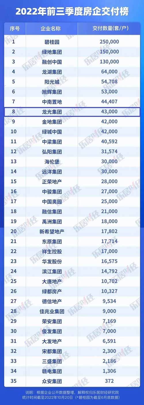 其中,2022年9月,龍光集團(tuán)共計(jì)完成了16個(gè)項(xiàng)目的高品質(zhì)交付,單月交付規(guī)模近1.6萬(wàn)套;葜蔟埞狻ぞ灵鸥、惠州龍光·玖龍臺(tái)、惠州龍光·玖云臺(tái)、東莞龍光·江南大境、潮州龍光·陽(yáng)光禧園、潮州龍光·陽(yáng)光華府、佛山龍光·天闕、南寧云創(chuàng)谷等多個(gè)項(xiàng)目,實(shí)現(xiàn)不同程度的提前交付,提前交付項(xiàng)目占當(dāng)月交付項(xiàng)目數(shù)量的一半。