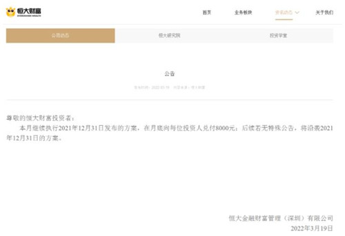 房訊網訊 3月19日,恒大財富官網公告,本月繼續(xù)執(zhí)行2021年12月31日發(fā)布的方案,在月底向每位投資人兌付8000元;后續(xù)若無特殊公告,將沿襲2021年12月31日的方案。