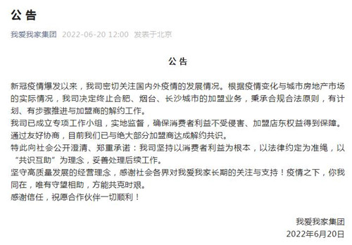 房訊網訊 6月20日,我愛我家集團發(fā)布公告,根據疫情變化與城市房地產市場的實際情況,集團決定終止合肥、煙臺、長沙城市的加盟業(yè)務,秉承合規(guī)合法原則,有計劃、有步驟推進與加盟商的解約工作。