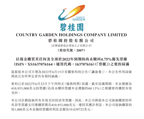 6月23日早間,碧桂園發(fā)布公告,公司以現(xiàn)金購(gòu)買(mǎi)于2022年7月到期的尚未贖回4.75%優(yōu)先票據(jù)的要約,已于2022年6月22日下午四時(shí)正(倫敦時(shí)間)屆滿。截至屆滿期限,投資人根據(jù)要約,自愿交回本金總額為410,953,000美元的票據(jù)(占尚未贖回票據(jù)本金總額約60.13%)。