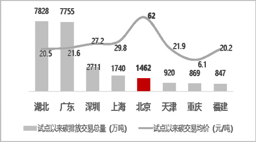 十年前,中國在北京、天津、上海、重慶、湖北、廣東及深圳開展了碳排放權(quán)交易試點(diǎn)工作,2016年新增福建碳交易試點(diǎn);試點(diǎn)期間我國共交易碳排放權(quán)限2.41億噸,其中湖北和廣州交易量最大;從交易均價(jià)來看,北京碳交易均價(jià)遠(yuǎn)超其他省市交易均價(jià)。2021年7月16日全國碳市場正式開市,截至2021年12月31日,全國碳市場第一個(gè)履約周期累計(jì)運(yùn)行114個(gè)交易日,碳排放配額累計(jì)成交量1.79億噸,累計(jì)成交額76.61億元。