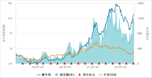 在證券市場,碳中和助推相關(guān)概念股交易增長,吸引二級(jí)市場資金流入,適量提前為國家碳市場發(fā)展儲(chǔ)備了資本資源。從2020年中開始,萬得數(shù)據(jù)監(jiān)測的碳中和指數(shù)開始超越滬深300指數(shù)一路上行。