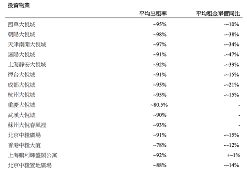 根據(jù)公告,大悅城地產(chǎn)在投資物業(yè)方面,朝陽(yáng)大悅城出租率最高達(dá)98%,天津南開(kāi)大悅城出租率97%排在第二,西單大悅城、成都大悅城和杭州大悅城出租率均為95%,排在第三。除了未披露平均租金單價(jià)同比情況的重慶大悅城、武漢大悅城和蘇州大悅春風(fēng)里,以及上海鵬利輝盛閣公寓同比增加1%外,其余項(xiàng)目的平均租金單價(jià)均同比下降,下降幅度最大的是沈陽(yáng)大悅城,同比下降47%,其次為上海靜安大悅城,同比下降39%。物業(yè)開(kāi)發(fā)方面,大悅城地產(chǎn)連同其附屬公司、聯(lián)營(yíng)公司和合營(yíng)公司獲得合同銷售總面積約為403013平方米,合同銷售額約162.97億元。