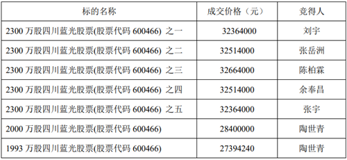 從公告的拍賣結(jié)果來看,此次拍賣的股份總共被6名自然人拍下。劉宇以3236.4萬元拍下2300萬股股份,張岳洲以3251.4萬元拍下2300萬股,陳柏霖以3266.4萬元拍下2300萬股,余奉昌以3251.4萬元拍下2300萬股,張宇以3236.4萬元拍下2300萬股,陶世青總計以5579.42萬元拍下3993萬股。以此來看,此次股份拍賣的金額總計約2.18億元。