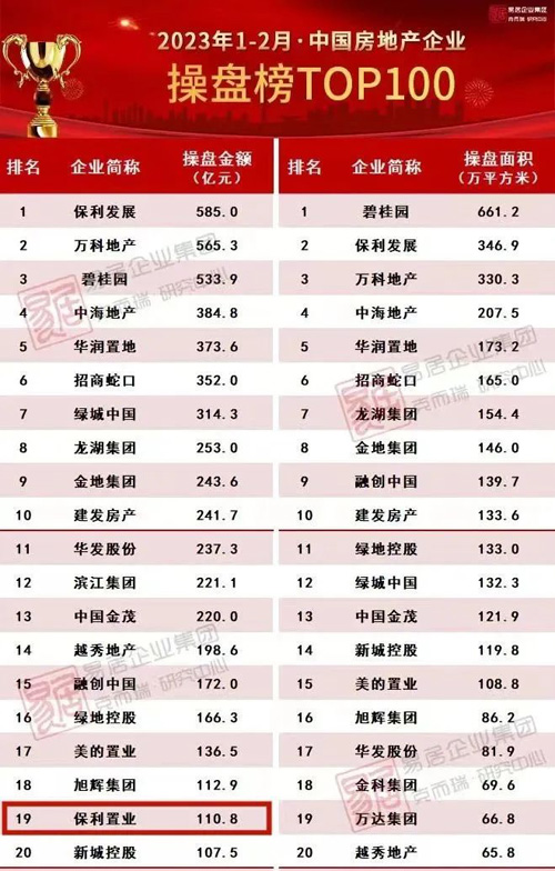 聚焦企業(yè)銷售,根據(jù)克而瑞地產(chǎn)研究中心發(fā)布2023年1-2月中國房地產(chǎn)企業(yè)操盤榜TOP100榜單中,保利置業(yè)位列第19位;銷售榜TOP100榜單中,位列第20位。2月單月全口徑位列19位、操盤位列17位、權(quán)益位列16位。行穩(wěn)致遠(yuǎn)、穩(wěn)步前行,榮登行業(yè)前20強(qiáng)。(數(shù)據(jù)來源《2023年1-2月中國房地產(chǎn)企業(yè)項目銷售TOP100》)