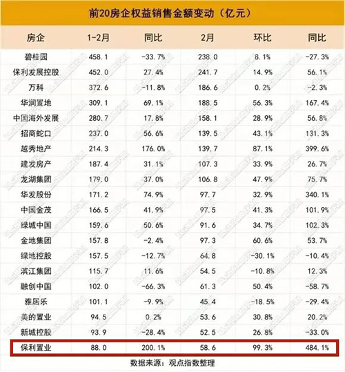 據(jù)“觀點指數(shù)”榜單顯示,前20房企權(quán)益銷售金額變動表中,保利置業(yè)1-2月實現(xiàn)同比增長200.1%。2月單月環(huán)比增長99.3%,實現(xiàn)簽約同比增長484.1%。1-2月,保利置業(yè)位居前20房企權(quán)益銷售金額同比增長率榜首,為全年奮戰(zhàn)開好頭、起好步。
