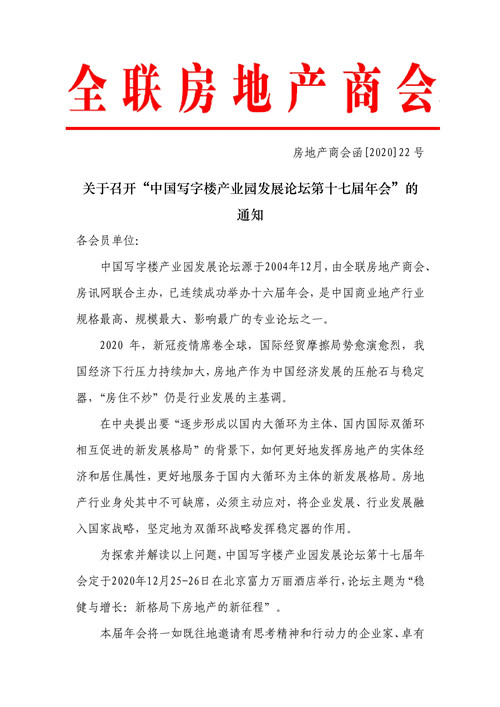 房訊網(wǎng)訊 近日,全聯(lián)房地產(chǎn)商會發(fā)布《關于召開“中國寫字樓產(chǎn)業(yè)園發(fā)展論壇第十七屆年會”的通知》,2020年12月25-26日,中國寫字樓產(chǎn)業(yè)園發(fā)展論壇第十七屆年會定于在北京富力萬麗酒店舉行,論壇主題為“重壓與重生:新格局下新商辦的新未來”。