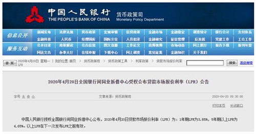 房訊網訊 4月20日,中國人民銀行公布新一期貸款市場報價利率(LPR)為:1年期LPR為3.85%,5年期以上LPR為4.65%。