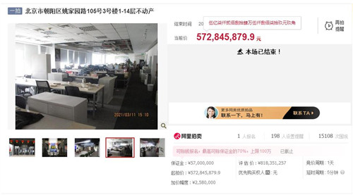 房訊網(wǎng)訊 11月30日,北京市朝陽區(qū)姚家園路105號3號樓1-14層不動產(chǎn)在淘寶網(wǎng)司法拍賣網(wǎng)絡(luò)平臺上拍賣,評估價約8.18億元,起拍價約5.73億元,保證金5700萬元。最終,該房產(chǎn)以起拍價被唯一報名方北京衡盈物業(yè)管理有限公司成功競得。