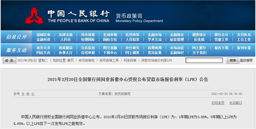 房訊網(wǎng)訊 中國人民銀行授權全國銀行間同業(yè)拆借中心公布,2021年2月20日貸款市場報價利率(LPR)為:1年期LPR為3.85%,5年期以上LPR為4.65%。以上LPR在下一次發(fā)布LPR之前有效。
