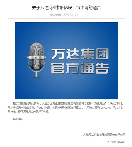 房訊網(wǎng)訊 3月24日,萬達集團官網(wǎng)發(fā)布《關(guān)于萬達商業(yè)撤回A股上市申請的通告》。