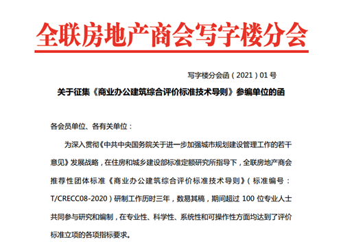 根據(jù)部分會員單位強(qiáng)烈要求,為使標(biāo)準(zhǔn)具有廣泛性和代表性,讓更多業(yè)內(nèi)優(yōu)秀企業(yè)共同參與本標(biāo)準(zhǔn)的編制工作,現(xiàn)面向全行業(yè)征集《商業(yè)辦公建筑綜合評價標(biāo)準(zhǔn)技術(shù)導(dǎo)則》參編單位。