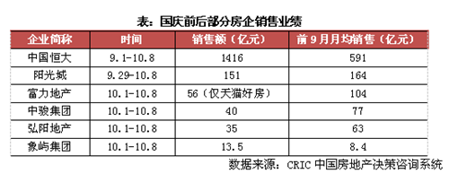 “十一”黃金周過后首日,恒大、富力、陽光城、弘陽等紛紛發(fā)布銷售數(shù)據(jù)。恒大9月1日至10月8日實現(xiàn)銷售額1416億元,根據(jù)CRIC推算,其“十一”黃金周期間,恒大的銷售達600億元左右,較去年同期上漲近20%,并且與前9月月均銷售相當(dāng)。陽光城國慶前后10天銷售額151億,接近前9月月均,富力僅在天貓好房平臺就實現(xiàn)56億元銷售。中駿、弘陽、象嶼“十一”期間分別實現(xiàn)40億、35以及13.5億銷售,均有明顯突破。