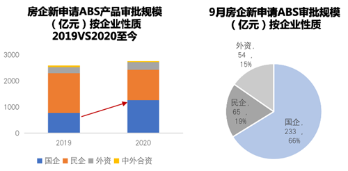 今年至今,國(guó)資房企新申請(qǐng)ABS產(chǎn)品總規(guī)模達(dá)1265億,同比大漲123%,已是去年全年申請(qǐng)總規(guī)模1.6倍。國(guó)企已逐漸超過(guò)民企成為房企資產(chǎn)證券化融資主力!叭龡l紅線(xiàn)“出臺(tái)后的九月,截至9月29日,國(guó)資房企9月新申請(qǐng)ABS項(xiàng)目總規(guī)模超200億,占比超6成。