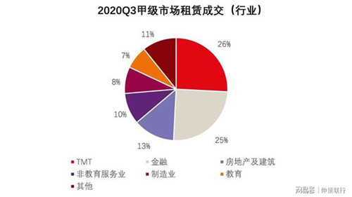 從行業(yè)細分來看,第三季度甲級辦公樓中,科技新媒體行業(yè)作為疫情影響下的受益行業(yè)持續(xù)發(fā)力,金融業(yè)依然呈現(xiàn)出韌性,這兩個行業(yè)貢獻了超過一半的成交面積,緊隨其后的是房地產(chǎn)與建筑及專業(yè)服務業(yè)。從甲級辦公樓的退租行業(yè)看,盡管教育行業(yè)處在資本風口,但行業(yè)內(nèi)部分化,部分公司由于戰(zhàn)略調(diào)整退出武漢市場。此外,第三方辦公服務運營公司持續(xù)受到疫情沖擊,去化壓力增大,也出現(xiàn)了部分退租現(xiàn)象。