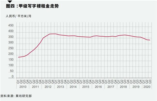 第三季度,全市甲級寫字樓平均租金為每月每平方米人民幣332.6元,環(huán)比下降0.9%,降幅與第二季度的3.5%比較呈現(xiàn)明顯收窄。