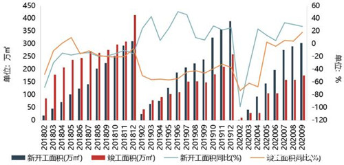 圖:2018年1月~2020年09月上海辦公樓新開工和竣工情況