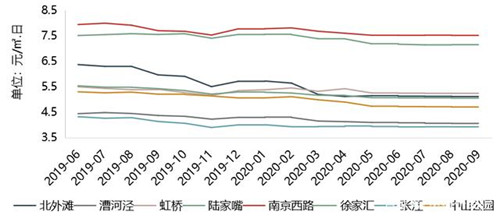 圖:2019年6月~2020年9月上海主要商圈甲乙級寫字樓租金走勢
