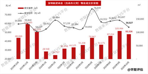 10月,深圳公寓市場新增融悅大廈、環(huán)球經(jīng)貿(mào)廣場、會展灣水岸廣場、翠湖大廈等4個預(yù)售項(xiàng)目,新增供應(yīng)面積16.85萬平方米。本月一手商業(yè)物業(yè)均價為56,027元/㎡,環(huán)比下跌12.0%。成交面積為93,526平方米,環(huán)比下跌11.8%,銷售仍保持暢旺,處于年內(nèi)高位。