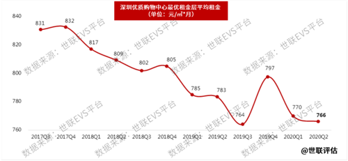 第二季度,深圳主要商圈優(yōu)質(zhì)購物中心最優(yōu)租金層平均租金下跌至766元/㎡·月,空置率顯著上升至4.5%。各大購物中心客流和銷售額有所恢復(fù),高端消費(fèi)仍維持低迷態(tài)勢,業(yè)主以價換量減少租戶流失。